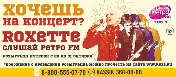 В честь 25-летнего юбилея Roxette отправляется в мировой тур 2014-2015! Ретро FM (105,1 FM) дарит возможность отправиться в музыкальное путешествие, увидеть грандиозное шоу группы и услышать любимые песни: «Joyride», «It Must Have Been Love» из культового фильма «Красотка», «Milk and Toast and Honey», «How Do You Do», «Sleeping In My Car», «Listen To Your Heart» и многие другие!