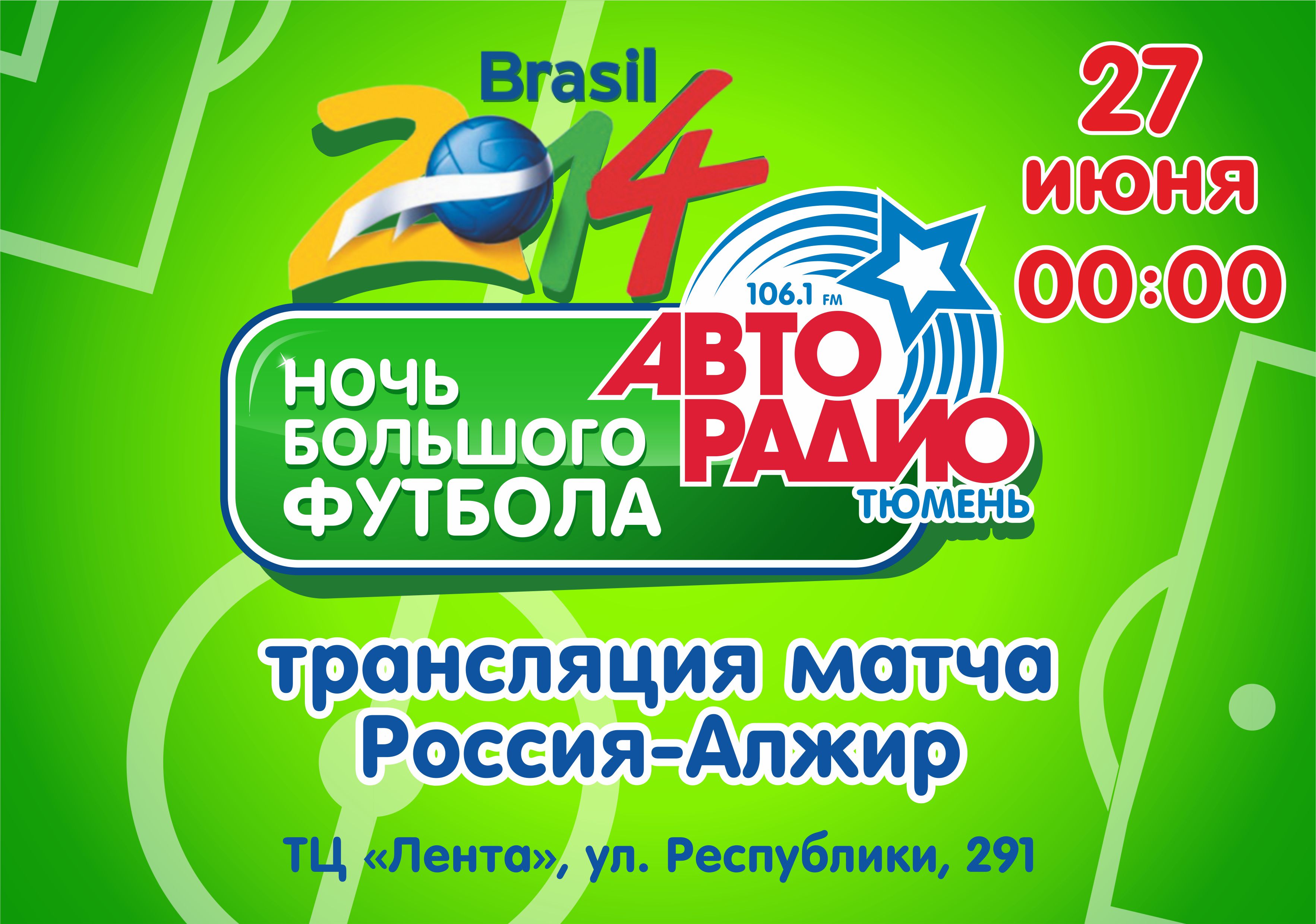 «Авторадио Тюмень» приглашает на грандиозное спортивное событие лета. В ночь с 26 на 27 июня на самом большом экране в городе на открытом воздухе смотрим матч за выход из группы: Россия – Алжир! Перед трансляцией поднимем дух яркой комедией. Повысим настроение выступлением черлидеров МФК «Тюмень» и футбольным фристайлом от чемпионов России. Истинные болельщики не останутся без подарков, предоставленных партнерами трансляции, и специальных призов от официального партнера футбольного клуба «Зенит» – сети ресторанов «Карлс Джуниор». Это будет самая жаркая ночь июня. Жарче только на поле в Рио. Вместе болеть! Вместе побеждать! Заезд автомобилей на парковку 26 июня в 23:30.