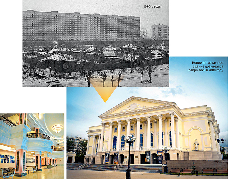 Ранее Тюменский драмтеатр располагался в бывшем соляном складе купца Андрея Текутьева на ул. Герцена. Аварийное состояние здания стало главной причиной строительства нового шикарного «дворца» на площади 400-летия Тюмени, хотя разговоры о его возведении велись давно. Сейчас это самый большой драматический театр России, его площадь – 36 000 м2. Он вошел в Книгу рекордов Тюменской области. А ранее там, где сейчас находится Большой Тюменский драмтеатр, стояли обычные деревянные домики.