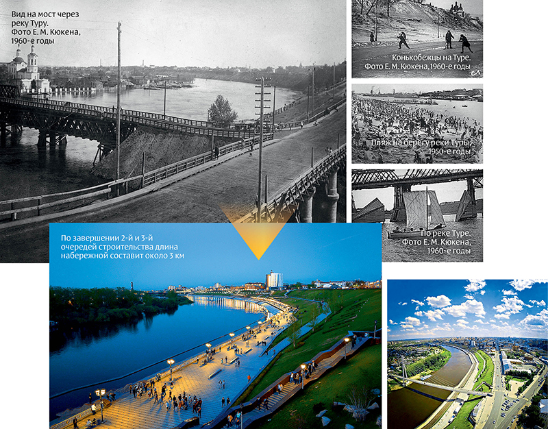 Первая в России четырехуровневая набережная и пешеходный вантовый мост – пожалуй, самый популярный «открыточный» вид Тюмени. Здесь часто проводят различные мероприятия, собираясь, словно на Арбате, и запуская небесные фонарики, а на мосту Влюблённых молодожены традиционно скрепляют брак замочком. Однако история помнит как деревянные мосты через реку (по ним даже ездил транспорт), так и пляж на берегу.