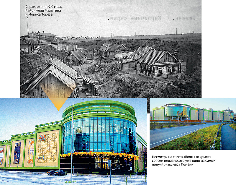 Район Сараи в Тюмени, получивший название от сараев многочисленных кирпичных заводов, был самым преступным в городе. Территория улиц Мориса Тореза и Малыгина (тогда – окраина Тюмени) именовалась Копыловские сараи – от завода купца Василия Копылова. Галерея «Вояж», открывшаяся в 2013 году на этом месте, – первая в городе fashion-галерея европейского формата с уникальными для Тюмени международными брендами.